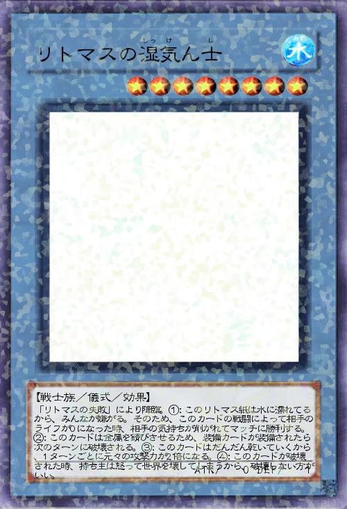 | 「リトマスの失敗」により降臨。①:このリトマス紙は水に濡れてるから、みんなが嫌がる。そのため、このカードの戦闘によって相手のライフが0になった時、相手の気持ちが削がれてマッチに勝利する。②:このカードは金属を錆びさせるため、装備カードが装備されたら次のターンに破壊される。③:このカードはだんだん乾いていくから、1ターンごとに元々の攻撃力が2倍になる。④:このカードが破壊された時、持ち主は怒って世界を壊してしまうから、破壊しない方がいい。 | |||