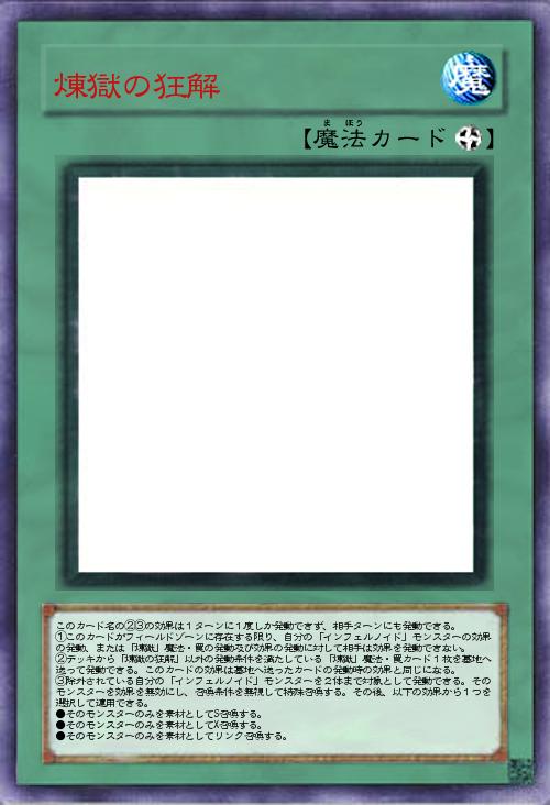 | このカード名の②③の効果は1ターンに1度しか発動できず、相手ターンにも発動できる。 ①このカードがフィールドゾーンに存在する限り、自分の「インフェルノイド」モンスターの効果の発動、または「煉獄」魔法・罠の発動及び効果の発動に対して相手は効果を発動できない。 ②デッキから「煉獄の狂解」以外の発動条件を満たしている「煉獄」魔法・罠カード1枚を墓地へ送って発動できる。このカードの効果は墓地へ送ったカードの発動時の効果と同じになる。 ③除外されている自分の「インフェルノイド」モンスターを2体まで対象として発動できる。そのモンスターを効果を無効にし、召喚条件を無視して特殊召喚する。その後、以下の効果から1つを選択して適用できる。 ●そのモンスターのみを素材としてS召喚する。 ●そのモンスターのみを素材としてX召喚する。 ●そのモンスターのみを素材としてリンク召喚する。 | |||
