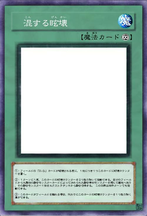 | ①:フィールドの「D.G」カードが破壊される度に、1枚につき1つこのカードに眩壊カウンターを置く。 ②:1ターンに1度、このカードの眩壊カウンターを2つ取り除いて発動できる。自分のフィールドから光属性の融合モンスターカードによって決められた融合素材モンスターを選んで墓地へ送り、その融合モンスター1体をエクストラデッキから融合召喚する。 この効果は相手ターンでも発動できる。 ③:このカードがフィールドを離れる場合、代わりにこのカードの眩壊カウンターを1つ取り除く事ができる。 | |||