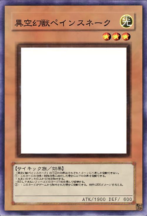 | 「異空幻獣ペインスネーク」の①②の効果はそれぞれ1ターンに1度しか発動できない。 ①:このカードの召喚・特殊召喚に成功した場合に以下の効果を発動できる。 ・お互いのデッキの上から1枚を除外する。 ・800LP支払いフィールドのカード1枚を選んで破壊する。 ②::このカードがゲームから除外された場合に発動できる。相手に800ダメージを与える。 | |||