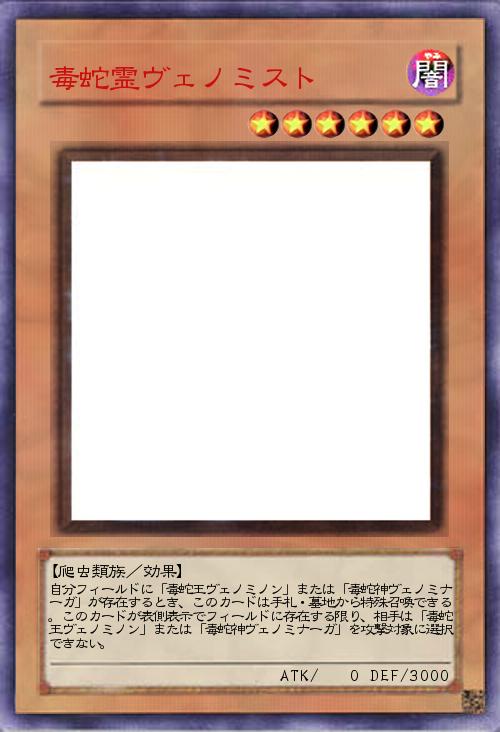 | 自分フィールドに「毒蛇王ヴェノミノン」または「毒蛇神ヴェノミナーガ」が存在するとき、このカードは手札・墓地から特殊召喚できる。このカードが表側表示でフィールドに存在する限り、相手は「毒蛇王ヴェノミノン」または「毒蛇神ヴェノミナーガ」を攻撃対象に選択できない。 | |||