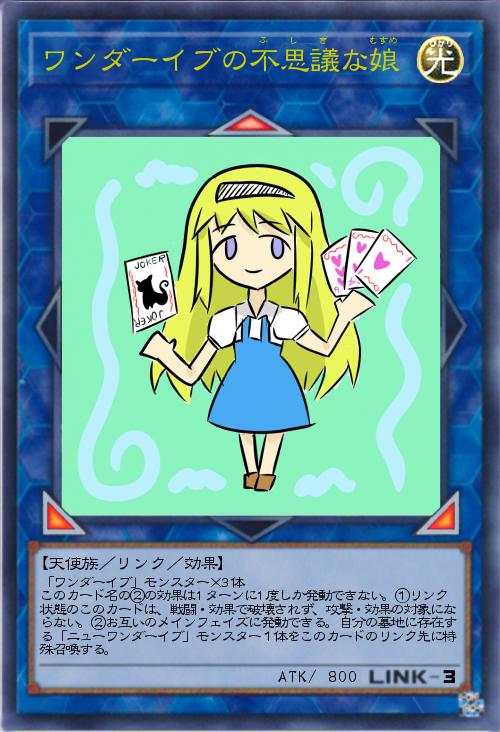 3体を必要とするのに打点は低いものの、お互いのメインフェイズでニューワンダーイヴを蘇生する効果、更にはリンク状態だと無敵になる耐性とワンダーイブ版ツィオルキンっぽい感じ。ただしニューワンダーイブの性質上、墓地に溜まりにくいので扱いにくそうだが扱えれば非常に強力。
