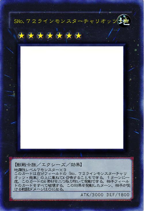 | 地属性レベル7モンスター×3 このカードは自分フィールドの「No.72ラインモンスターチャリオッツ・飛車」の上に重ねてX召喚することもできる。1ターンに一度、このカードのX素材を二つ取り除いて発動できる。相手フィールドのカードをすべて破壊する。この効果を発動したターン、相手が受ける戦闘ダメージは0になる。 | |||