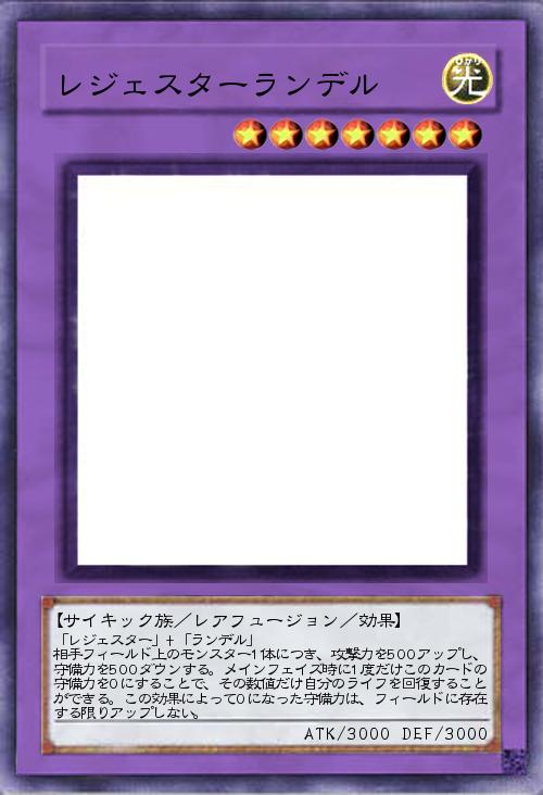 | 「レジェスター」+「ランデル」 相手フィールド上のモンスター1体につき、攻撃力を500アップし、守備力を500ダウンする。メインフェイズ時に1度だけこのカードの守備力を0にすることで、その数値だけ自分のライフを回復することができる。この効果によって0になった守備力は、フィールドに存在する限りアップしない。 | |||
