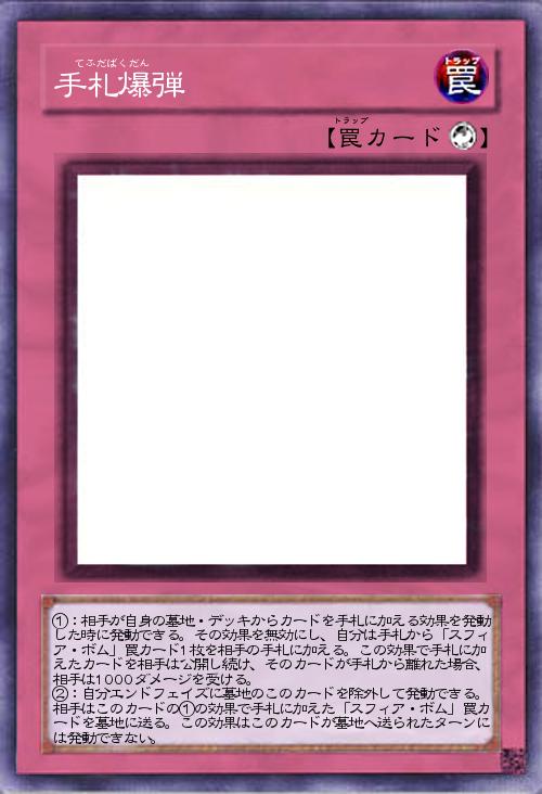 | ①:相手が自身の墓地・デッキからカードを手札に加える効果を発動した時に発動できる。その効果を無効にし、自分は手札から「スフィア・ボム」罠カード1枚を相手の手札に加える。この効果で手札に加えたカードを相手は公開し続け、そのカードが手札から離れた場合、相手は1000ダメージを受ける。 ②:自分エンドフェイズに墓地のこのカードを除外して発動できる。相手はこのカードの①の効果で手札に加えた「スフィア・ボム」罠カードを墓地に送る。この効果はこのカードが墓地へ送られたターンには発動できない。 | |||
