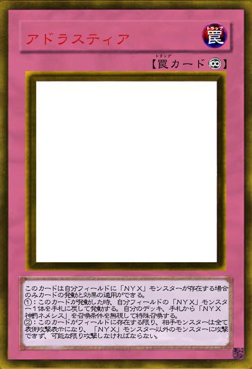 | このカードは自分フィールドに「NYX」モンスターが存在する場合のみカードの発動と効果の適用ができる。 ①:このカードが発動した時、自分フィールドの「NYX」モンスター1体を手札に戻して発動する。自分のデッキ、手札から「NYX 神罰ネメシス」を召喚条件を無視して特殊召喚する。 ②:このカードがフィールドに存在する限り、相手モンスターは全て表側攻撃表示になり、「NYX」モンスター以外のモンスターに攻撃できず、可能な限り攻撃しなければならない。 | |||