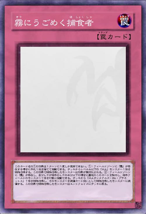 霧が存在する場合に手札1枚をコストにレベル4以下のMAのリクルートができます。効果は無効化されますが、いろいろ有効活用しましょう。そして、霧が存在して、自分ライフが相手ライフの半分以下の場合に相手モンスター1体を対象に墓地から除外して、デッキから触手を呼んで、対象モンスターを装備させることができます。出てきた触手はエンドには帰るので、装備したモンスターも一緒に霧の中に消えていきます…。」(2018-06-04 18:00)
