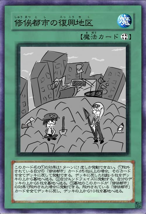除外されている修俟都市が5枚以上であれば除外カード全部をデッキに戻して、戻した数-5だけ墓地肥やしができると、除外リセットからの大量墓地肥やしが期待できそうですね。エンドにはデッキから5枚を肥やせると、もうとにかく墓地肥やしで、その枚数もかなりの物。墓地肥やしが異常な速さですすむぅ~。