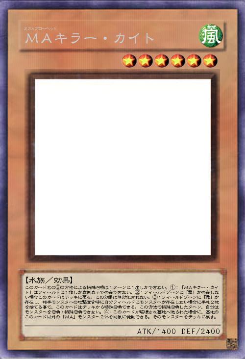 | このカード名の③の方法による特殊召喚は1ターンに1度しかできない。①:「MAキラー・カイト」はフィールドに1体しか表側表示で存在できない。②:フィールドゾーンに「霧」が存在しない場合このカードはデッキに戻る。この効果は無効化されない。③:フィールドゾーンに「霧」が存在し、相手モンスターの攻撃宣言時に自分フィールドにモンスターが存在しない場合に手札2枚を捨てる事で、このカードはデッキから特殊召喚できる。この方法で特殊召喚したターン、自分はモンスターを召喚・特殊召喚できない。④:このカードが破壊され墓地へ送られた場合に、墓地のこのカード以外の「MA」モンスター2体を対象に発動できる。そのモンスターをデッキに戻す。 | |||