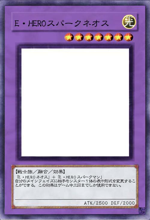 | 「E・HEROネオス」+「E・HEROスパークマン」 自分のメインフェイズに相手モンスター1体の表示形式を変更することができる。この効果はゲーム中三回までしか使用できない。 | |||