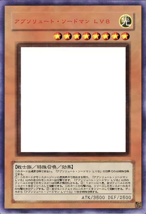 | このカードは通常召喚できない。「アブソリュート・ソードマン LV6」の効果でのみ特殊召喚できる。 ①:このカードがモンスターゾーンに表側表示で存在する限り、「アブソリュート・ソードマン LV8」以外の自分のモンスターは攻撃できず、「アブソリュート・ソードマン LV8」以外のフィールドの全てのモンスターは効果が無効化される。②:1ターンに1度、自分フィールドのモンスター1体をリリースして発動できる。このカードの攻撃力は、リリースしたモンスターの元々の攻撃の半分アップする。③:自分エンドフェイズにこのカードをリリースして発動できる。デッキから「アブソリュート・ソードマン LV10」1体を特殊召喚する。 | |||