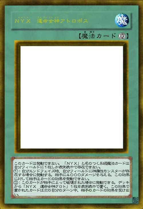 | このカードは発動できない。「NYX」と名のつく永続魔法カードは自分フィールドに1枚しか表側表示で存在できない。 ①:自分エンドフェイズ時、自分フィールドに神属性モンスターが存在する場合に発動する。相手に4000ダメージを与える。この効果に対して相手はカードの効果を発動できない。 ②:このカードが相手によって破壊された場合に発動できる。デッキから「NYX 運命女神クロト」1枚を表側表示で置く。この効果で置かれたカードは次の自分のターン中、相手のカードの効果を受けない。 | |||