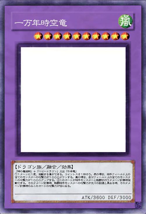 | 「時の魔術師」+「ベビードラゴン」又は「千年竜」 ①1ターンに1度、発動する事ができる。コイントスを1回行う。表の場合、相手フィールド上の全てのモンスターの攻撃力が1000ダウンする。裏の場合、自分フィールド上の全てのモンスターの攻撃力が1000アップする。②このカードが相手モンスターと戦闘を行うダメージ計算時発動できる。そのダメージ計算時、戦闘相手モンスターの攻撃力が元々の数値と異なる時、そのダメージ計算時のみこのカードの攻撃力が倍になる。 | |||