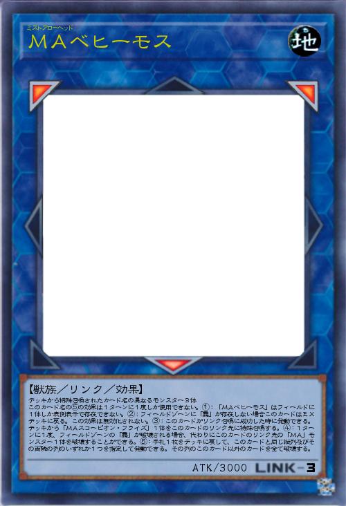 | デッキから特殊召喚されたカード名の異なるモンスター3体 このカード名の⑤の効果は1ターンに1度しか使用できない。①:「MAベヒーモス」はフィールドに1体しか表側表示で存在できない。②:フィールドゾーンに「霧」が存在しない場合このカードはEXデッキに戻る。この効果は無効化されない。③:このカードがリンク召喚に成功した時に発動できる。デッキから「MAスコーピオン・フライズ」1体をこのカードのリンク先に特殊召喚する。④:1ターンに1度、フィールドゾーンの「霧」が破壊される場合、代わりにこのカードのリンク先の「MA」モンスター1体を破壊することができる。⑤:手札1枚をデッキに戻して、このカードと同じ縦列及びその両隣の列のいずれか1つを指定して発動できる。その列のこのカード以外のカードを全て破壊する。 | |||