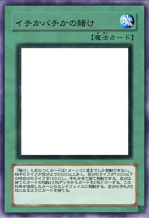 | 「賭け」と名のつくカードは1ターンに1度までしか発動できない。相手のライフが自分より3000以上多く、自分のライフが1000以下の時自分のライフを100にし、手札を全て捨て発動できる。自分は捨てたカードの枚数+2枚デッキからカードを2枚ドローする。この効果を使用したターンのエンドフェイスに発動する。自分の手札が2枚になるようにカードを捨てる。 | |||