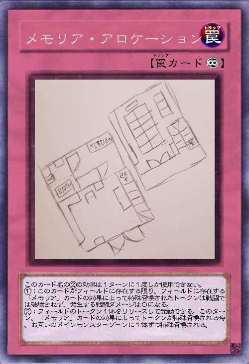 イラストはメモリCのメモリィの家の図。どうやら米式らしい。ただし2Fのメモリシステムの部屋は完全に会社。トークンの保護とトークンを利用してトークンが生成される時、お互いのフィールド両方に割り当てて生成する効果。お互いの版面がトークンだらけになるので自分ターンでは相手の版面の占領、相手は自分へのトークン提供と地味に厄介。ちなみに今後、自分か相手のメインモンスターゾーンがいっぱいの時に使えるメモリアカードが登場予定です。