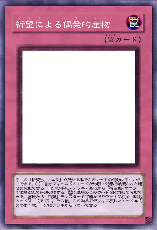 | 手札の「祈望獣-マユラ」を見せる事でこのカードの発動は手札からもできる。①:自分フィールドのカードが戦闘・効果で破壊された場合に発動できる。自分の手札・デッキ・墓地から「祈望獣-マユラ」1体を選んで特殊召喚する。②:墓地のこのカードを除外して発動できる。墓地から「祈望」モンスターを可能な限りデッキに戻す(同名カードは1枚まで)。その後、この効果でデッキに戻したカード4枚につき1枚、自分はデッキからドローできる。 | |||