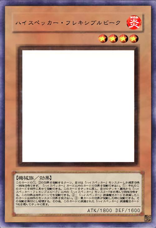 | このカードの①、③の効果を発動するターン、自分は「ハイスペッカー」モンスターしか通常召喚・特殊召喚できず、「ハイスペッカー」カード以外のカードの効果を発動できない。①:手札のこのカードを相手に見せて発動できる。このカードをデッキに戻し、自分のデッキ・墓地から「ハイスペッカー・フレキシブルビーク」以外の「ハイスペッカー」モンスター1体を選んで特殊召喚する。この効果は相手ターンでも発動できる。②:「ハイスペッカー」装備魔法カードを装備したこのカードは相手のモンスター効果を受けない。③:罠カードの効果が発動した時に発動できる。その発動を無効にし破壊する。その後、このカードに装備された「ハイスペッカー」装備魔法カード1枚を選んでデッキに戻す。 | |||