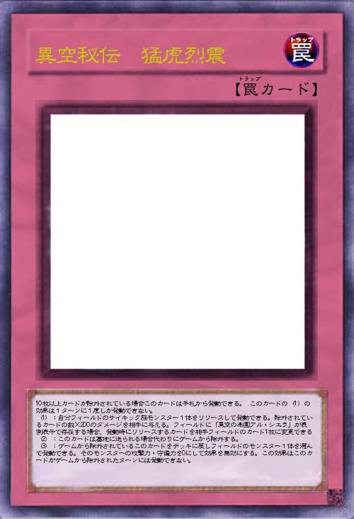 | 10枚以上カードが除外されている場合このカードは手札から発動できる。 このカードの(1)の効果は1ターンに1度しか発動できない。 (1):自分フィールドのサイキック族モンスター1体をリリースして発動できる。除外されているカードの数×200のダメージを相手に与える。フィールドに「異空の楽園アル・シエラ」が表側表示で存在する場合、発動時にリリースするカードを相手フィールドのカード1枚に変更できる (2):このカードは墓地に送られる場合代わりにゲームから除外する。 (3):ゲームから除外されているこのカードをデッキに戻しフィールドのモンスター1体を選んで発動できる。そのモンスターの攻撃力・守備力を0にして効果を無効にする。この効果はこのカードがゲームから除外されたターンには発動できない。 | |||
