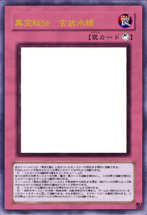 | 自分フィールド上に「異空幻獣」と名のついたモンスターが存在する場合に発動できる。 10枚以上カードが除外されている場合このカードは手札から発動できる。 (1):このカードの発動時に積まれていたチェーン上の 全ての相手の効果モンスターの効果・魔法・罠カードの発動を無効にし、この効果で発動を無効にしたカード全てをゲームから裏側で除外する。 フィールドに「異空の楽園アル・シエラ」が表側表示で存在する場合、続けてこの効果によって除外されたカードの数まで相手の墓地からカードを除外できる。 (2):このカードは墓地に送られる場合代わりにゲームから除外する。 (3):相手がモンスターの召喚・特殊召喚・反転召喚を行う場合に、ゲームから除外されているこのカードをデッキに戻して発動できる。それを無効にし、そのモンスターを裏側で除外する。この効果はこのカードがゲームから除外されたターンには発動できない。 | |||