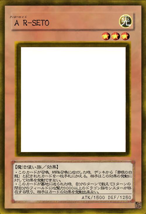 | ・このカードが召喚、特殊召喚に成功した時、デッキから「青眼の白龍」と記されたカードを一枚手札に加える。相手はこの効果の発動に対して効果を発動できない。 ・このカードが墓地に送られた時、自分のターンで数えて3ターンの間自分のフィールドに攻撃力3000以上のドラゴン族モンスターが存在する限り、相手はカードの効果を発動出来ない。 | |||