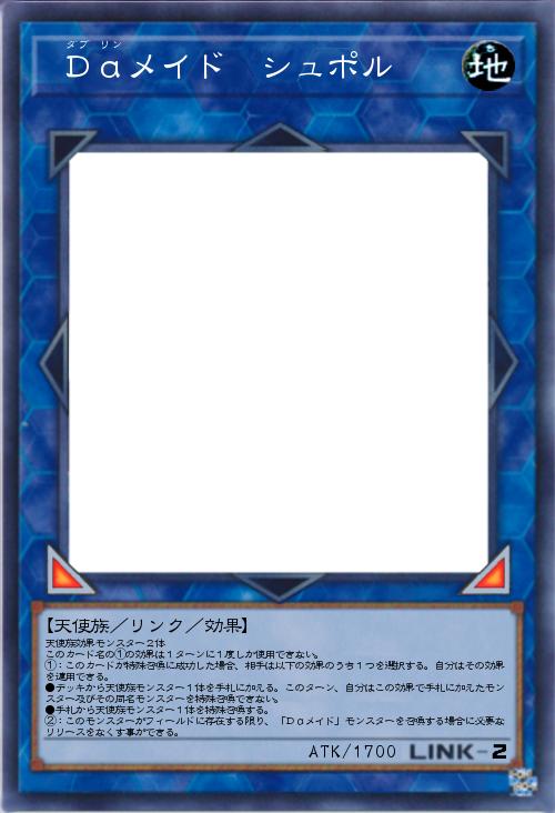 | 天使族効果モンスター2体 このカード名の①の効果は1ターンに1度しか使用できない。 ①:このカードが特殊召喚に成功した場合、相手は以下の効果のうち1つを選択する。自分はその効果を適用できる。 ●デッキから天使族モンスター1体を手札に加える。このターン、自分はこの効果で手札に加えたモンスター及びその同名モンスターを特殊召喚できない。 ●手札から天使族モンスター1体を特殊召喚する。 ②:このモンスターがフィールドに存在する限り、「Daメイド」モンスターを召喚する場合に必要なリリースをなくす事ができる。 | |||
