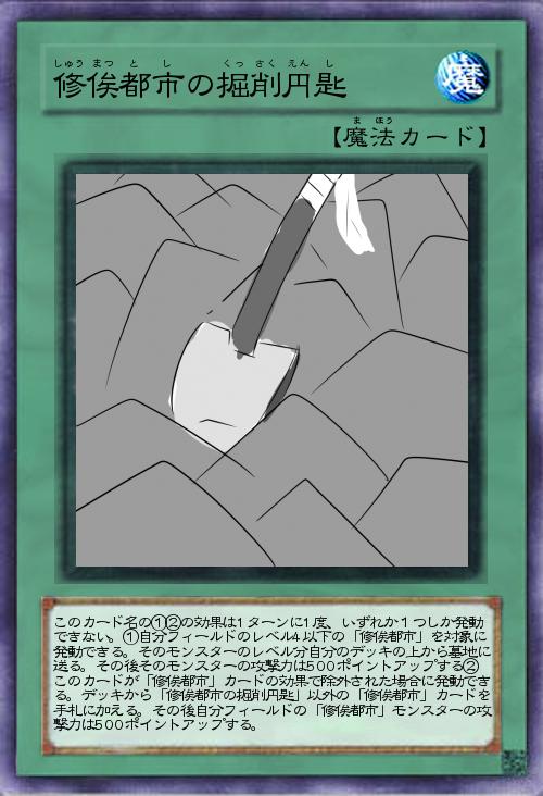 | このカード名の①②の効果は1ターンに1度、いずれか1つしか発動できない。①自分フィールドのレベル4以下の「修俟都市」を対象に発動できる。そのモンスターのレベル分自分のデッキの上から墓地に送る。その後そのモンスターの攻撃力は500ポイントアップする②このカードが「修俟都市」カードの効果で除外された場合に発動できる。デッキから「修俟都市の掘削円匙」以外の「修俟都市」カードを手札に加える。その後自分フィールドの「修俟都市」モンスターの攻撃力は500ポイントアップする。 | |||
