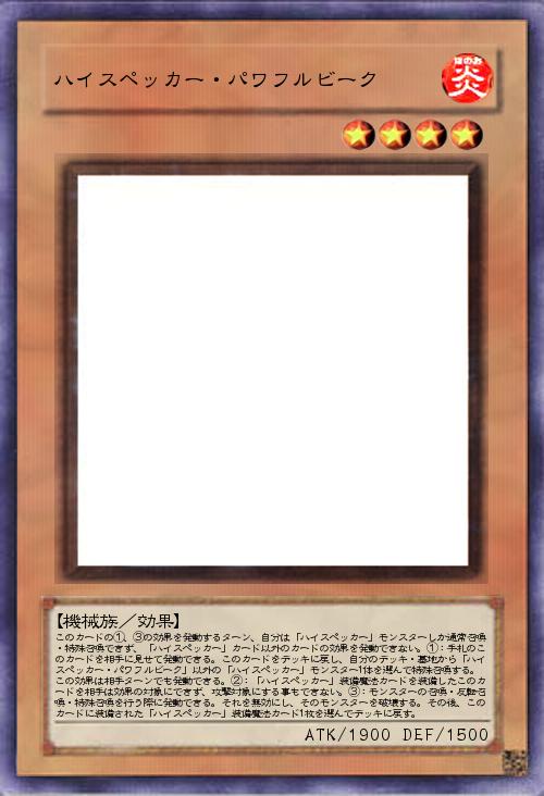 | このカードの①、③の効果を発動するターン、自分は「ハイスペッカー」モンスターしか通常召喚・特殊召喚できず、「ハイスペッカー」カード以外のカードの効果を発動できない。①:手札のこのカードを相手に見せて発動できる。このカードをデッキに戻し、自分のデッキ・墓地から「ハイスペッカー・パワフルビーク」以外の「ハイスペッカー」モンスター1体を選んで特殊召喚する。この効果は相手ターンでも発動できる。②:「ハイスペッカー」装備魔法カードを装備したこのカードを相手は効果の対象にできず、攻撃対象にする事もできない。③:モンスターの召喚・反転召喚・特殊召喚を行う際に発動できる。それを無効にし、そのモンスターを破壊する。その後、このカードに装備された「ハイスペッカー」装備魔法カード1枚を選んでデッキに戻す。 | |||