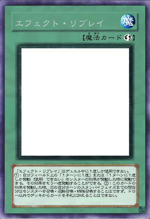 | 「エフェクト・リプレイ」はデュエル中に1度しか使用できない。 ①:自分フィールド上の「1ターンに1度」または「1ターンに1度しか発動(使用)できない」モンスターの効果が発動した時に発動できる。その効果をもう一度発動することができる。②:このカードの効果を発動した時、次の自分ターンのスタンバイフェイズまでの間自分はモンスターを召喚・反転召喚・特殊召喚することはできず、ドロー以外でデッキからカードを手札に加えることはできない。 | |||
