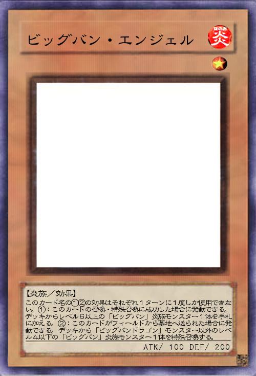 | このカード名の①②の効果はそれぞれ1ターンに1度しか使用できない。①:このカードの召喚・特殊召喚に成功した場合に発動できる。デッキからレベル6以上の「ビッグバン」炎族モンスター1体を手札に加える。②:このカードがフィールドから墓地へ送られた場合に発動できる。デッキから「ビッグバンドラゴン」モンスター以外のレベル4以下の「ビッグバン」炎族モンスター1体を特殊召喚する。 | |||