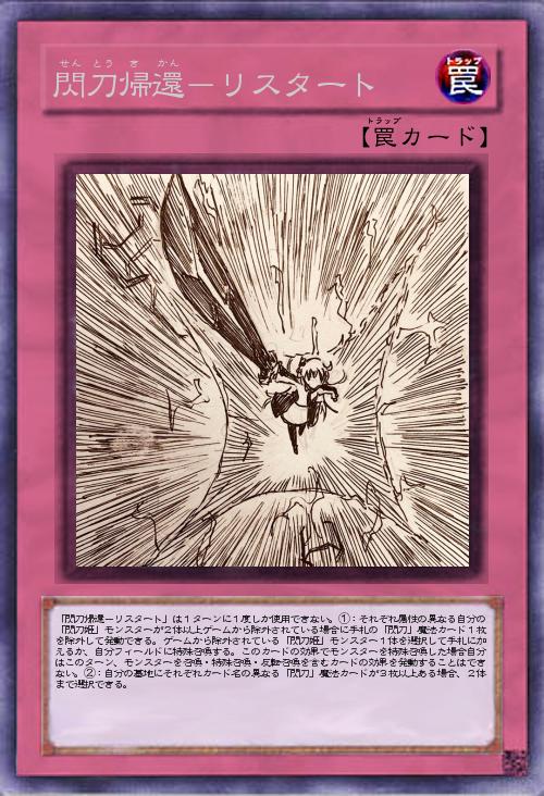 | 「閃刀帰還-リスタート」は1ターンに1度しか使用できない。①:それぞれ属性の異なる自分の「閃刀姫」モンスターが2体以上ゲームから除外されている場合に手札の「閃刀」魔法カード1枚を除外して発動できる。ゲームから除外されている「閃刀姫」モンスター1体を選択して手札に加えるか、自分フィールドに特殊召喚する。このカードの効果でモンスターを特殊召喚した場合自分はこのターン、モンスターを召喚・特殊召喚・反転召喚を含むカードの効果を発動することはできない。②:自分の墓地にそれぞれカード名の異なる「閃刀」魔法カードが3枚以上ある場合、2体まで選択できる。 | |||