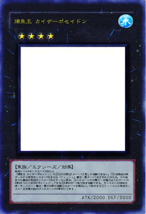 | 魚族レベル4モンスター×3体以上 「爆魚王 カイザーポセイドン」の③④の効果は1ターンに1度しか発動できない。①X召喚成功時デッキから魚族モンスター1体または「フィッシュ」魔法・罠カード1枚を手札に加える。その後自分の墓地の魚族モンスター1体をデッキに戻す。②このカードの攻撃力・守備力はこのカードのX素材1つにつき300ポイントアップする③X素材を1つ取り除き発動できる。モンスターの特殊召喚・モンスター・魔法・罠の効果の発動どれか一つを無効にして除外する④フィールドの魚族モンスターを任意の数だけこのカードのX素材にできる 。 | |||