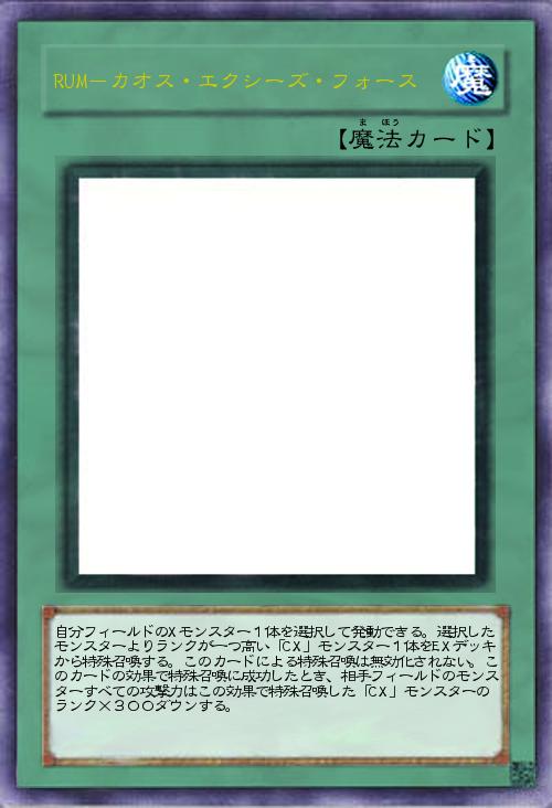 「カオスエクシーズ専用のRUMです。特殊召喚を無効化されない効果と相手モンスターを弱体化効果を持ってます。」(2018-06-26 22:24)