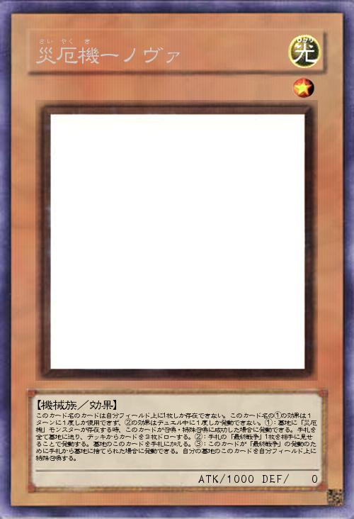 | このカード名のカードは自分フィールド上に1枚しか存在できない。このカード名の①の効果は1ターンに1度しか使用できず、②の効果はデュエル中に1度しか発動できない。①:墓地に「災厄機」モンスターが存在する時、このカードが召喚・特殊召喚に成功した場合に発動できる。手札を全て墓地に送り、デッキからカードを3枚ドローする。②:手札の「最終戦争」1枚を相手に見せることで発動する。墓地のこのカードを手札に加える。③:このカードが「最終戦争」の発動のために手札から墓地に捨てられた場合に発動できる。自分の墓地のこのカードを自分フィールド上に特殊召喚する。 | |||