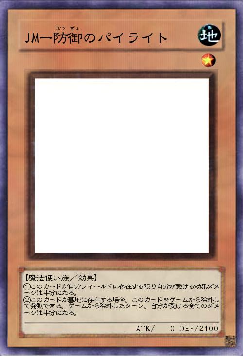 | ①このカードが自分フィールドに存在する限り自分が受ける効果ダメージは半分になる。 ②このカードが墓地に存在する場合、このカードをゲームから除外して発動できる。ゲームから除外したターン、自分が受ける全てのダメージは半分になる。 | |||