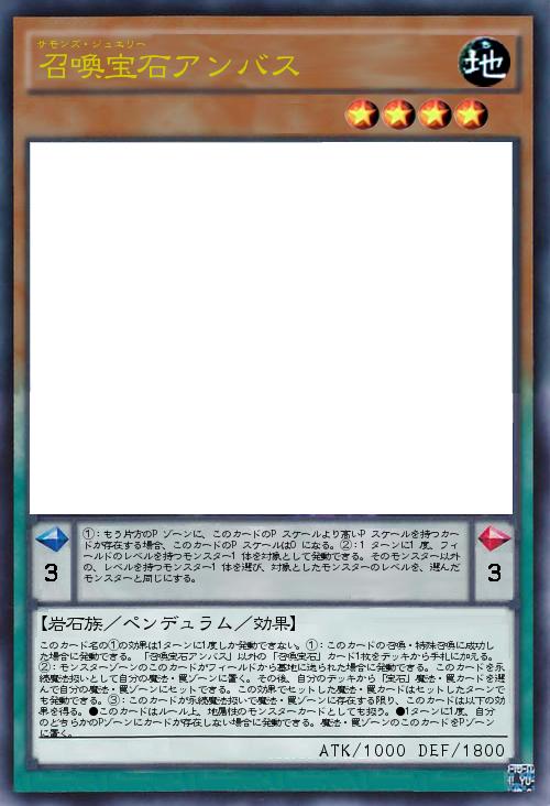 | このカード名の①の効果は1ターンに1度しか発動できない。①:このカードの召喚・特殊召喚に成功した場合に発動できる。「召喚宝石アンバス」以外の「召喚宝石」カード1枚をデッキから手札に加える。②:モンスターゾーンのこのカードがフィールドから墓地に送られた場合に発動できる。このカードを永続魔法扱いとして自分の魔法・罠ゾーンに置く。その後、自分のデッキから「宝石」魔法・罠カードを選んで自分の魔法・罠ゾーンにセットできる。この効果でセットした魔法・罠カードはセットしたターンでも発動できる。③:このカードが永続魔法扱いで魔法・罠ゾーンに存在する限り、このカードは以下の効果を得る。●このカードはルール上、地属性のモンスターカードとしても扱う。●1ターンに1度、自分のどちらかのPゾーンにカードが存在しない場合に発動できる。魔法・罠ゾーンのこのカードをPゾーンに置く。 | |||