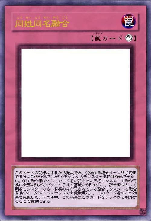 | このカードの効果は手札から発動でき、発動する場合ターン終了時まで自分は融合召喚でしかEXデッキからモンスターを特殊召喚できない。①:融合素材としてカード名が記された同名モンスターを融合召喚に必要な数だけデッキ・手札・墓地から除外して、融合素材として同名モンスターのカード名のみが記されている融合モンスターを融合召喚する(ダメージステップでも発動可能)。このカード名のこの効果を発動したデュエル中、この効果はこのカードをデッキから除外することで発動できる。 | |||