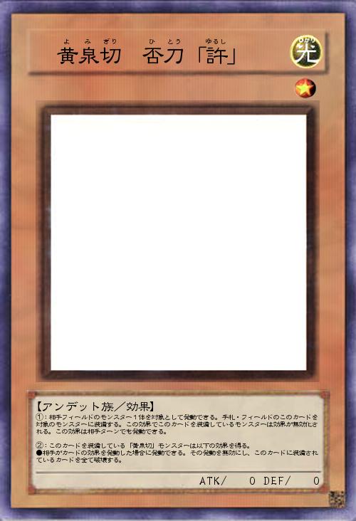 | ①:相手フィールドのモンスター1体を対象として発動できる。手札・フィールドのこのカードを対象のモンスターに装備する。この効果でこのカードを装備しているモンスターは効果が無効化される。この効果は相手ターンでも発動できる。 ②:このカードを装備している「黄泉切」モンスターは以下の効果を得る。 ●相手がカードの効果を発動した場合に発動できる。その発動を無効にし、このカードに装備されているカードを全て破壊する。 | |||