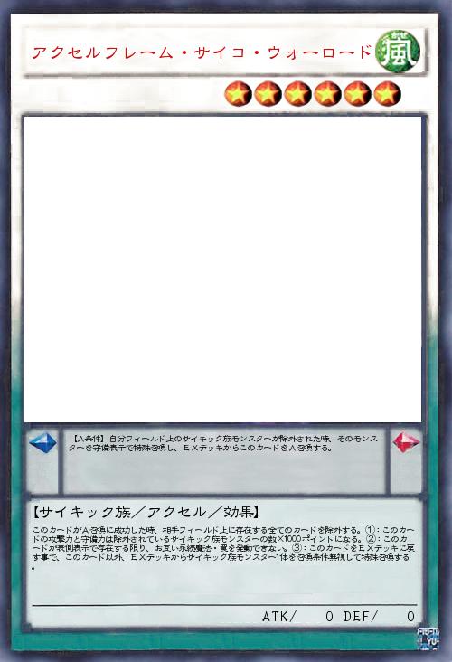 | このカードがA召喚に成功した時、相手フィールド上に存在する全てのカードを除外する。①:このカードの攻撃力と守備力は除外されているサイキック族モンスターの数×1000ポイントになる。②:このカードが表側表示で存在する限り、お互い永続魔法・罠を発動できない。③:このカードをEXデッキに戻す事で、このカード以外、EXデッキからサイキック族モンスター1体を召喚条件無視して特殊召喚する。 | |||