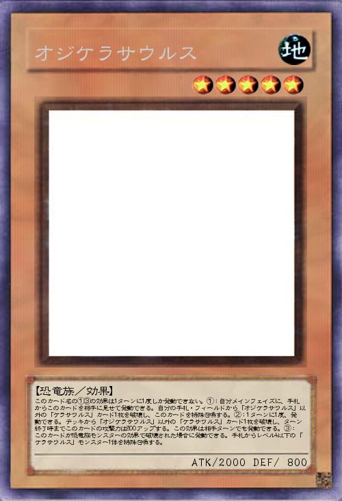 | このカード名の①③の効果は1ターンに1度しか発動できない。①:自分メインフェイズに、手札からこのカードを相手に見せて発動できる。自分の手札・フィールドから「オジケラサウルス」以外の「ケラサウルス」カード1枚を破壊し、このカードを特殊召喚する。②:1ターンに1度、発動できる。デッキから「オジケラサウルス」以外の「ケラサウルス」カード1枚を破壊し、ターン終了時までこのカードの攻撃力は800アップする。この効果は相手ターンでも発動できる。③:このカードが恐竜族モンスターの効果で破壊された場合に発動できる。手札からレベル4以下の「ケラサウルス」モンスター1体を特殊召喚する。 | |||