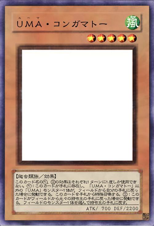 | このカード名の①、②の効果はそれぞれ1ターンに1度しか使用できない。①:このカードが手札に存在し、「UMA・コンガマトー」以外の「UMA」モンスター1体が、フィールドから自分の手札に戻った場合に発動できる。このカードを手札から特殊召喚する。②:このカードがフィールドから元々の持ち主の手札に戻った場合に発動できる。フィールドのモンスター1体を選んで持ち主の手札に戻す。 | |||