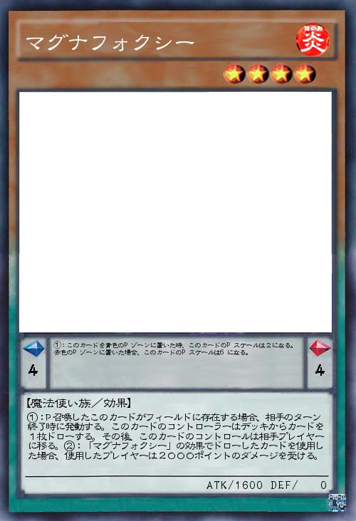 | ①:P召喚したこのカードがフィールドに存在する場合、相手のターン終了時に発動する。このカードのコントローラーはデッキからカードを1枚ドローする。その後、このカードのコントロールは相手プレイヤーに移る。②:「マグナフォクシー」の効果でドローしたカードを使用した場合、使用したプレイヤーは2000ポイントのダメージを受ける。 | |||
