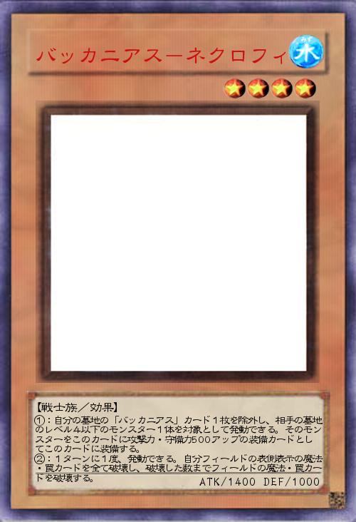 | ①:自分の墓地の「バッカニアス」カード1枚を除外し、相手の墓地のレベル4以下のモンスター1体を対象として発動できる。そのモンスターをこのカードに攻撃力・守備力500アップの装備カードとしてこのカードに装備する。 ②:1ターンに1度、発動できる。自分フィールドの表側表示の魔法・罠カードを全て破壊し、破壊した数までフィールドの魔法・罠カードを破壊する。 | |||