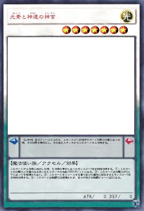 | このカードがA召喚に成功した時、E召喚の素材となったモンスター1体を特殊召喚する。①:このカードの攻撃力と守備力はお互いのEXデッキの枚数×800ポイントになる。②:このカードは攻撃力が0以下になっても破壊されない。③:このカードをリリースする事で自分の墓地に存在するEモンスター1体を特殊召喚する。④:このカードは戦闘では破壊されず、自分が受ける戦闘ダメージは0になる。 | |||