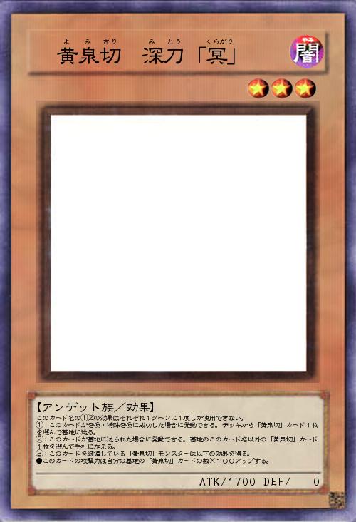 | このカード名の①②の効果はそれぞれ1ターンに1度しか使用できない。 ①:このカードが召喚・特殊召喚に成功した場合に発動できる。デッキから「黄泉切」カード1枚を選んで墓地に送る。 ②:このカードが墓地に送られた場合に発動できる。墓地のこのカード名以外の「黄泉切」カード1枚を選んで手札に加える。 ③:このカードを装備している「黄泉切」モンスターは以下の効果を得る。 ●このカードの攻撃力は自分の墓地の「黄泉切」カードの数×100アップする。 | |||