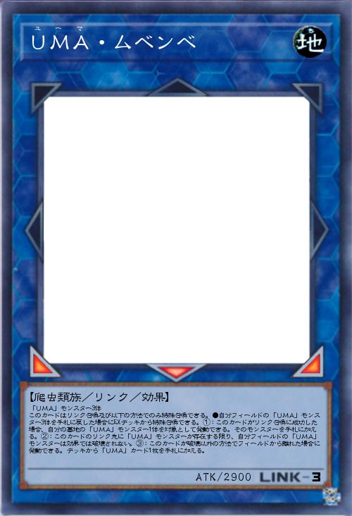 | 「UMA」モンスター3体 このカードはリンク召喚及び以下の方法でのみ特殊召喚できる。●自分フィールドの「UMA」モンスター3体を手札に戻した場合にEXデッキから特殊召喚できる。①:このカードがリンク召喚に成功した場合、自分の墓地の「UMA」モンスター1体を対象として発動できる。そのモンスターを手札に加える。②:このカードのリンク先に「UMA」モンスターが存在する限り、自分フィールドの「UMA」モンスターは効果では破壊されない。③:このカードが破壊以外の方法でフィールドから離れた場合に発動できる。デッキから「UMA」カード1枚を手札に加える。 | |||