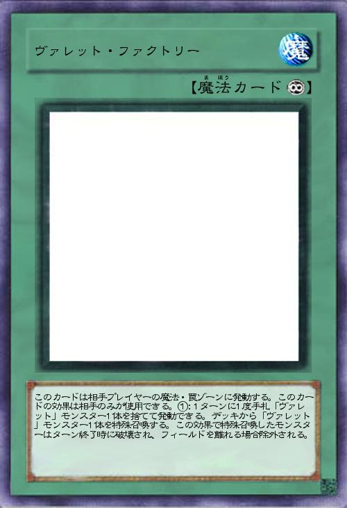 | このカードは相手プレイヤーの魔法・罠ゾーンに発動する。このカードの効果は相手のみが使用できる。①:1ターンに1度手札「ヴァレット」モンスター1体を捨てて発動できる。デッキから「ヴァレット」モンスター1体を特殊召喚する。この効果で特殊召喚したモンスターはターン終了時に破壊され、フィールドを離れる場合除外される。 | |||