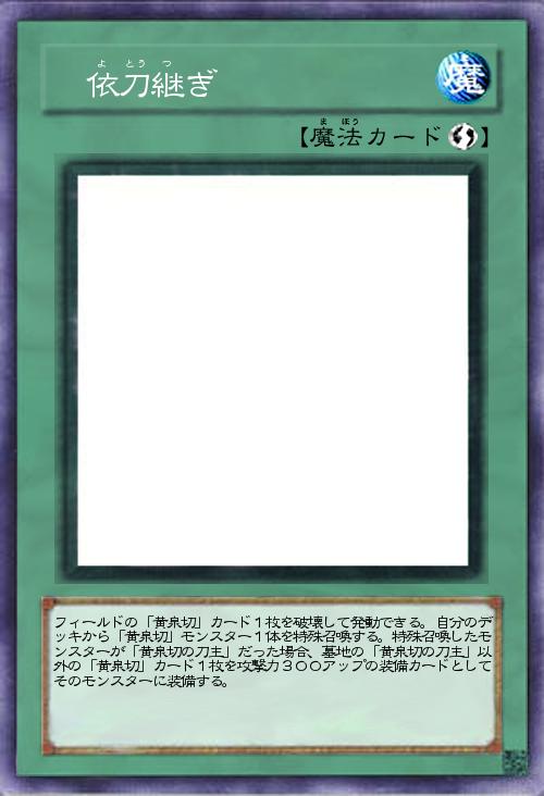 | フィールドの「黄泉切」カード1枚を破壊して発動できる。自分のデッキから「黄泉切」モンスター1体を特殊召喚する。特殊召喚したモンスターが「黄泉切の刀主」だった場合、墓地の「黄泉切の刀主」以外の「黄泉切」カード1枚を攻撃力300アップの装備カードとしてそのモンスターに装備する。 | |||