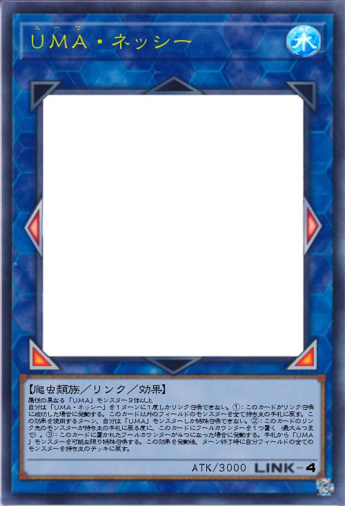 | 属性の異なる「UMA」モンスター3体以上 自分は「UMA・ネッシー」を1ターンに1度しかリンク召喚できない。①:このカードがリンク召喚に成功した場合に発動する。このカード以外のフィールドのモンスターを全て持ち主の手札に戻す。この効果を使用するターン、自分は「UMA」モンスターしか特殊召喚できない。②:このカードのリンク先のモンスターが持ち主の手札に戻る度に、このカードにフールカウンターを1つ置く(最大4つまで)。③:このカードに置かれたフールカウンターが4つになった場合に発動する。手札から「UMA」モンスターを可能な限り特殊召喚する。この効果を発動後、ターン終了時に自分フィールドの全てのモンスターを持ち主のデッキに戻す。 | |||