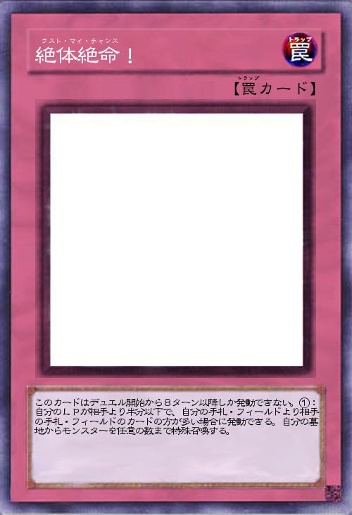 デュエル開始から8ターン以降でしか発動ができず、自分ライフが相手の半分以下かつ自分の手札・フィールドのカードの数が相手の手札・フィールドの数より少なくないと発動ができないと条件は厳しい。その分、効果は墓地から好きな数モンスターの蘇生が行えると非常に強力な効果!カード名通り、絶対絶命からの最後のチャンスという訳ですな。制約が厳しくはありますが、爆発力はかなりの物。8ターン目以降でしか使えない部分を譲歩できれば、逆転の1手として採用が期待。てか、比較的スローリーなデュエルであれば、全然採用からの活躍ができますね。